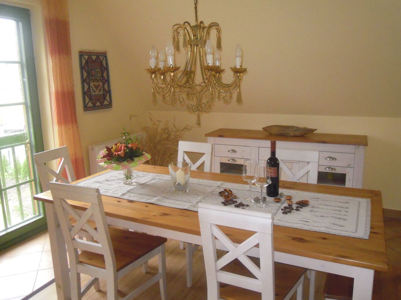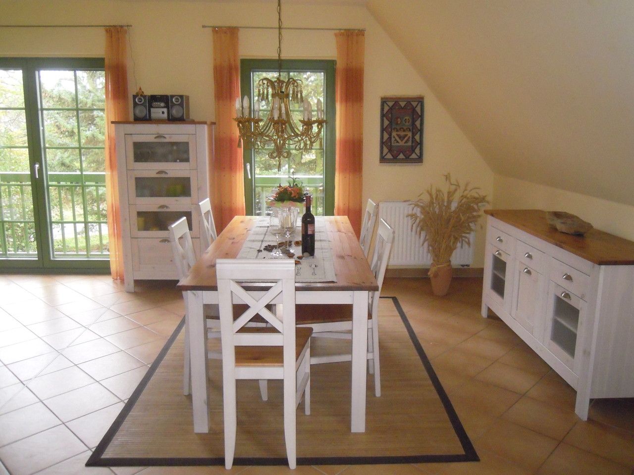 Die Wohnung besticht durch eine offene und helle Architektur. Der große Wohn- und Essbereich bildet das Zentrum der Wohnung und wird durch eine gemütliche Leseecke ergänzt – der ideale Ort, um mit einem Buch die Ruhe des Darßes zu genießen. Zur technischen Ausstattung gehören ein SAT-TV, DVD- und CD-Player sowie kostenfreies WLAN.