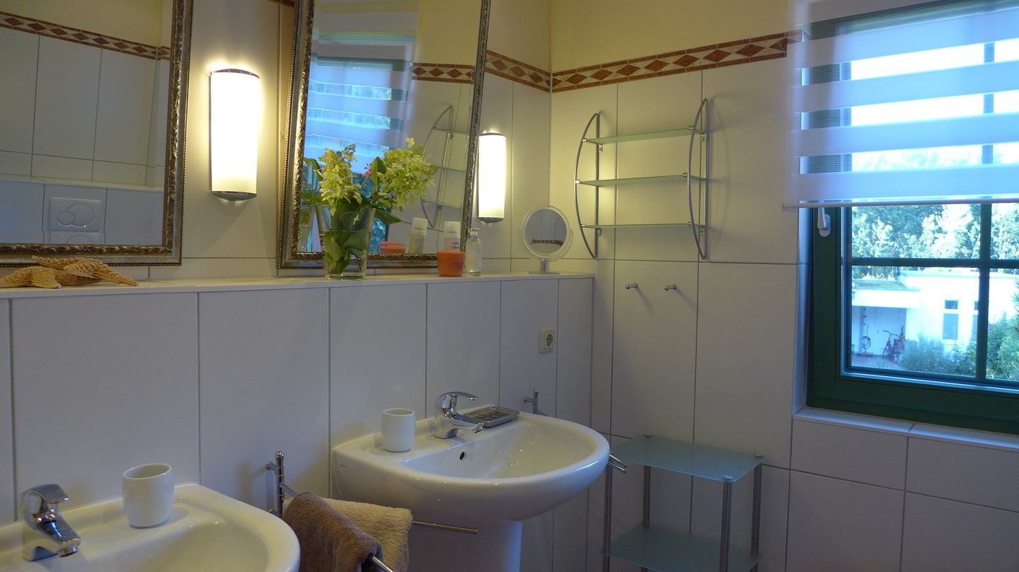 Die Wohnung verfügt über zwei separate Schlafzimmer, was sie ideal für Familien oder gemeinsam reisende Paare macht. Beide Räume sind mit Insektenschutzgittern und elektrischen Rollläden ausgestattet. Ein besonderes Plus an Komfort bietet die sanitäre Ausstattung: Neben dem Hauptbadezimmer mit zwei Waschbecken, Dusche und Fußbodenheizung steht ein zusätzliches Gäste-WC zur Verfügung, um den morgendlichen Ablauf zu entspannen.