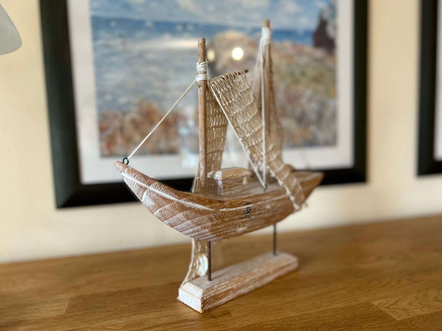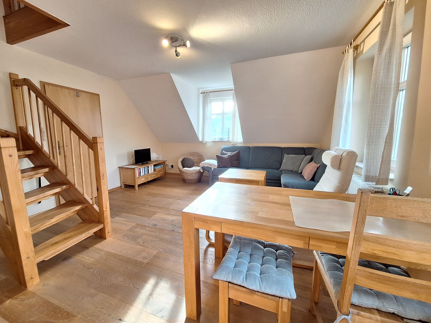Im liebevoll eingerichteten Wohnzimmer finden Sie eine komfortable Sitzecke, einen Fernseher und einen kleinen Schreibtisch – ideal, falls Sie auch im Urlaub etwas arbeiten möchten. Die separate Küche ist vollständig ausgestattet mit Herd, Backofen, Kühlschrank, Kaffeemaschine, Wasserkocher und Geschirr – so können Sie sich bequem selbst versorgen.
